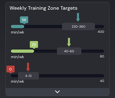 These targets show a range of minutes to aim for in each zone every week to steadily improve (or maintain) cardiovascular fitness.