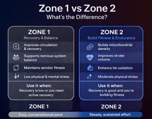 Zone 1 and Zone 2 are both aerobic — but they serve different physiological roles.